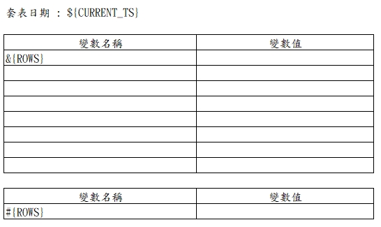 檔案內容 將自動替換回傳的變數名稱, 此例為 ${CURRENT_TS} 及 ${REPORT_DATE},